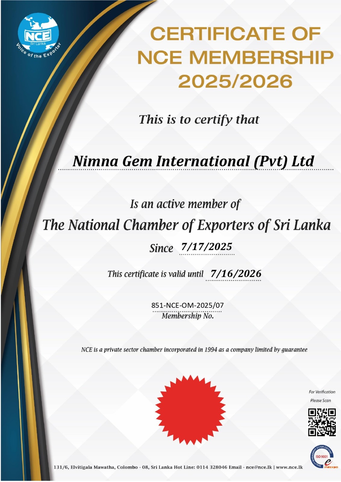 Nimna Gem International Secures Membership with The National Chamber of Exporters of Sri Lanka for 2025/2026